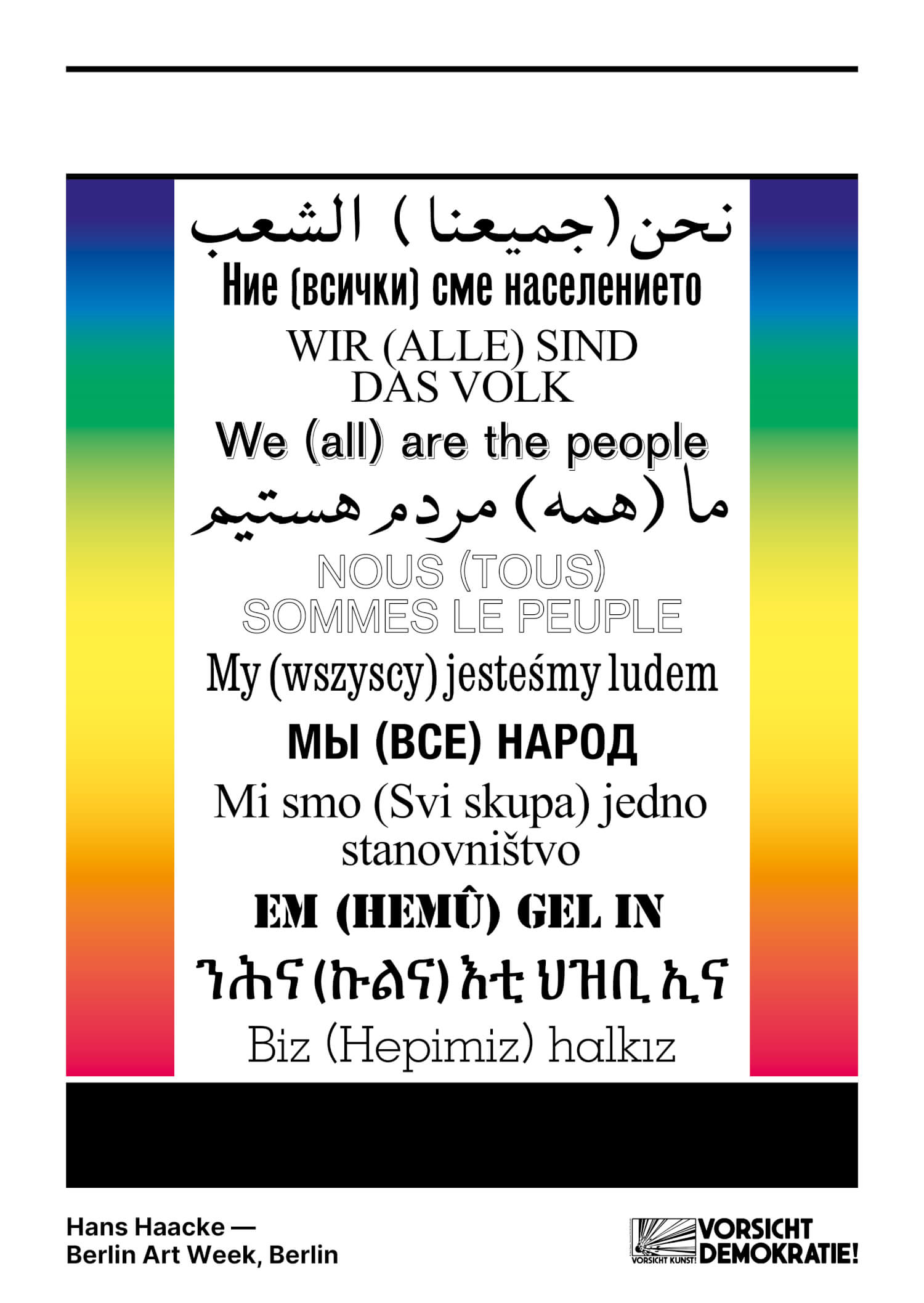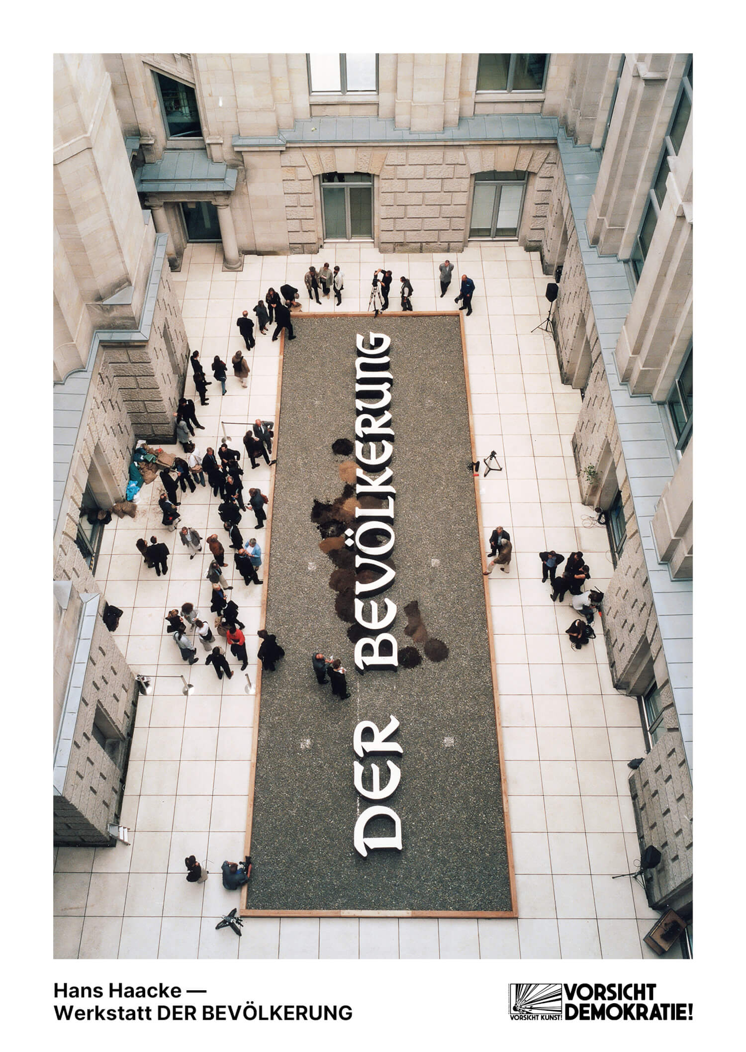 Initiiert wurde das Kooperationsformat ›VORSICHT DEMOKRATIE!‹ von der ›Werkstatt Der Bevölkerung‹ und der Kampagnen-Auftakt gemeinsam mit der Berlin Art Week und Kulturprojekte Berlin umgesetzt.