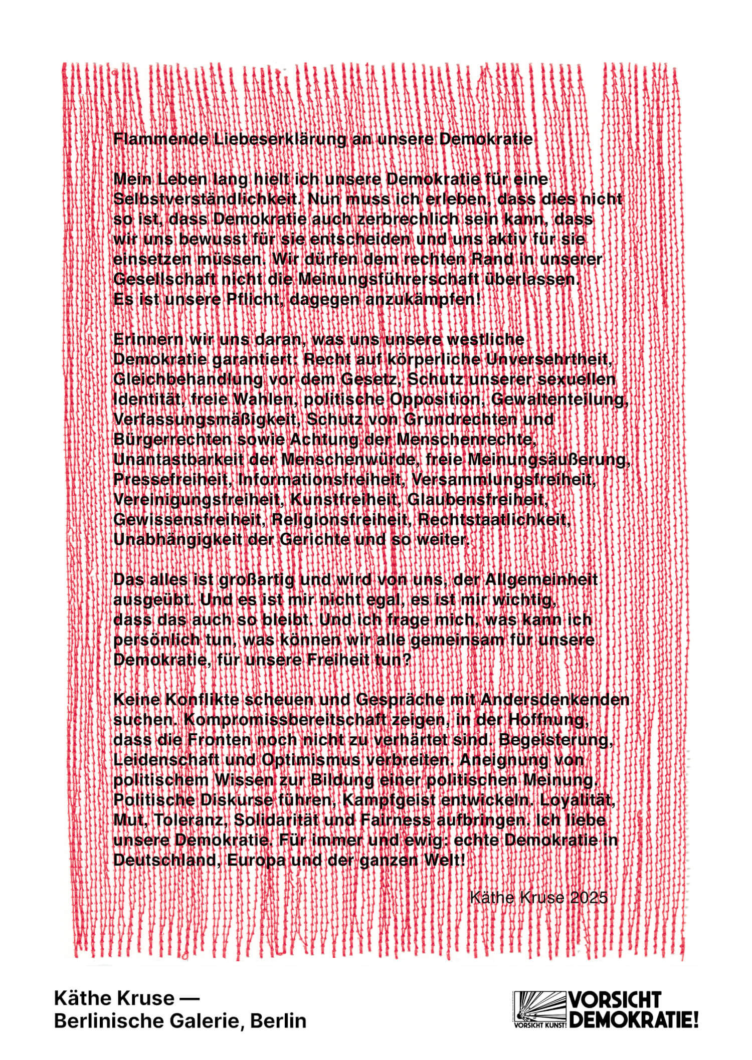 Die Kooperations-Kampagne ›Vorsicht Demokratie!‹ setzt als Kunst- und Kulturinitiative im Rahmen der Berlin Art Week 2025 ein sichtbares Zeichen für Freiheit, Pluralität und rechtsstaatliche Grundwerte. Vorsicht Demokratie!